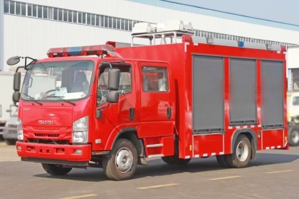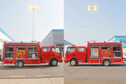 駕駛室頂部前端為長排警燈,車身后配有24V/60W火場照明燈一只,車輛兩側(cè)上方各配有紅藍(lán)相配的爆閃燈,下方安裝安全標(biāo)志燈,乘員室、器材箱、 泵房內(nèi)均裝有照明燈,加裝有100W警報器,回轉(zhuǎn)警燈開關(guān)、通訊設(shè)備預(yù)備接口。