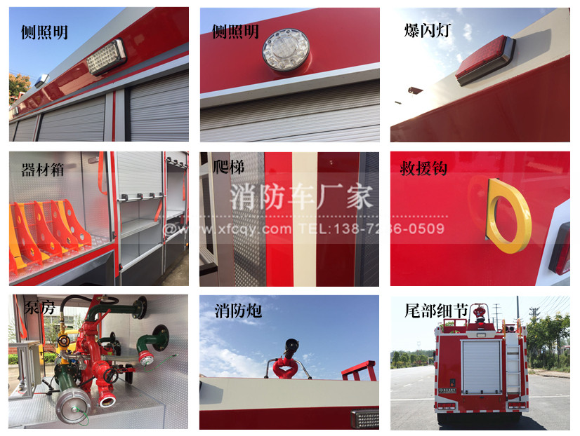 消防車標配:空氣泡沫槍、消防吸水管、濾水器、分水器、集水器、消防水帶、水帶掛鉤、水帶包布、異徑接口、同型接口、直流水槍、開花水槍、直流開關水槍、消防鎬、地上扳手、地下扳手、吸水管扳手、水帶護橋、泡沫器吸液管、腰斧、消防斧、鐵鍬、撬扛等。